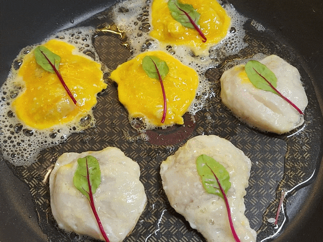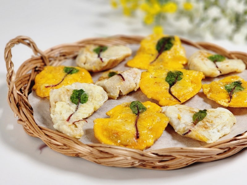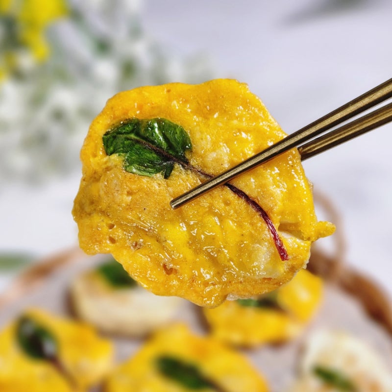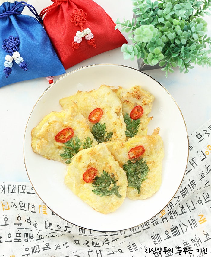 명절 음식이나 제사 음식이 아닌 동태전을 만들었는데, 노란 개나리와 흰 뱃살을 컨셉으로 만들기 위해 계란 흰자와 노른자를 분리하여 설날 어묵튀김을 만들었습니다.