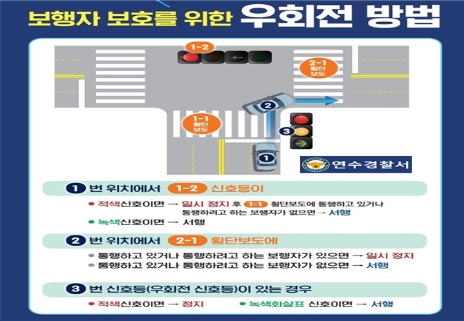 인천연수경찰서(신윤균 과장)도로교통법 개정 시행에 따른 올바른 우회전 교통문화 정착을 위해 개정법을 위반한 경우, 위반 사항에 대한 세부 정보를 제공하기 위한 정책 및 지원 활동을 실시했습니다. 23그날 말했다.