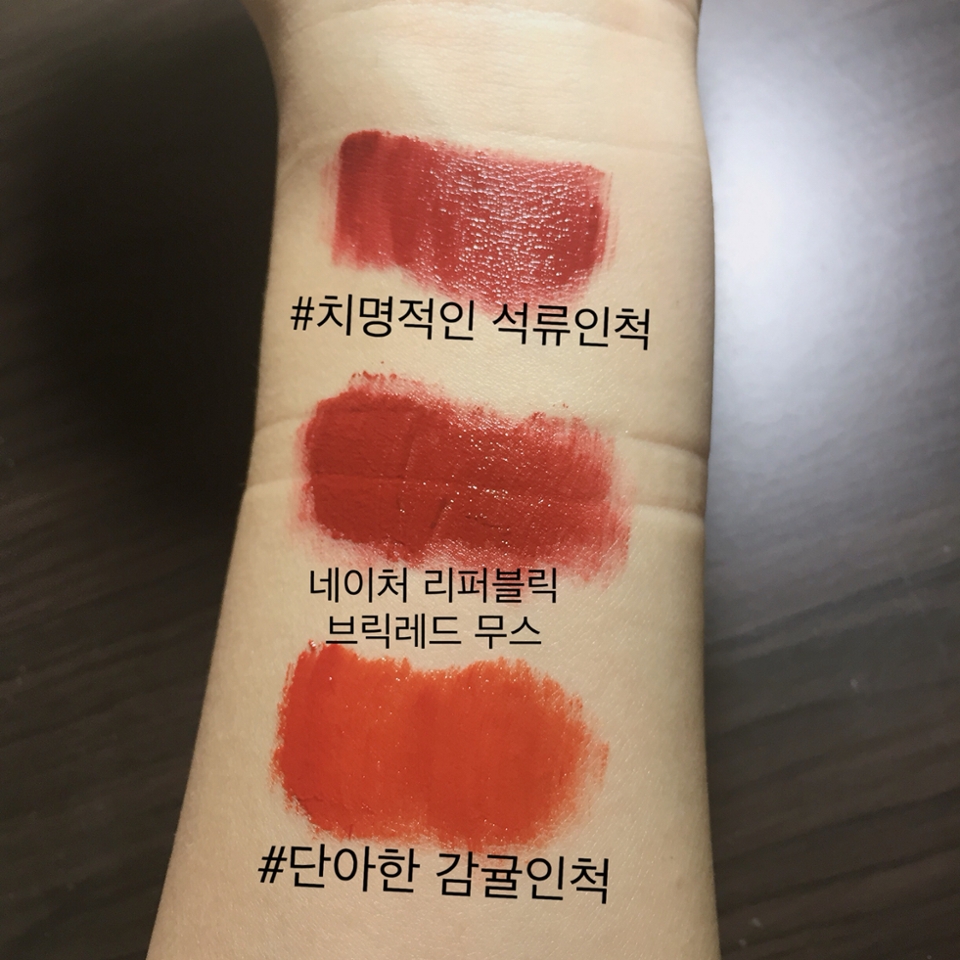 손바닥에 올려보니 작아보이네요. 미니 사이즈인 건 알지만 직접 보니 사이즈가 좀 부끄럽기도 하고 너무 귀여워서 뿅 갔어요. 나는 이전에 이 크기의 미니 쉐이드가 포함된 로맨틱 라이어 키트를 게시했지만 동일한 컨테이너를 사용했음을 알게 되었습니다. 컬러차트에서 가져온 06 데들리 석류척이 그 중 가장 잘 어울리는 컬러! 릴리바이레드의 모델은 예나인데 상세페이지의 뉴스레터가 너무 예뻐서 또 반했어요. Jena Pick 컬러는 페리윙클이 가미된 04 오렌지-브라운이지만, 보기에도 매우 매력적입니다. 상품설명에는 밤처럼 서서히 물들어가는 벨벳 컬러라고 하는데, 부드러운 텍스처로 블렌딩 후 발림성이 매우 부드럽고 블러링되며 그라데이션으로 발라도 예뻐요. 릴리바이레드 드라이어리스 벨벳 틴트는 벨벳 텍스처가 매트하지 않고 살짝 광택이 나는 제형이에요. 매트 벨벳 립스틱은 가끔 아름답게 바르기 어려울 수 있지만 바르기 쉽고 촉촉합니다. 다만 벨벳이라 바르기 전 립밤으로 케어를 해주어야 바르면 잘 발려요. 미니 사이즈이기 때문에 폴의 길이가 짧아서 심장이 빨리 뛸 수 있습니다. . 귀엽지 않나요? 애플리케이터는 끝이 푹신하고 약간 구부러져 있습니다. 팁은 레귤러 사이즈와 같은 색조인 것 같습니다. 요즘은 립 컬러를 바를 때 손바닥에 펴발라요. 제 손바닥은 꽤 주름이 많은 편이라 주름진 입술에 바르면 어떤 느낌인지 대략적으로 알 수 있어요. 그것은 젖은 상태로 적용되며 약간 벨벳처럼 마무리됩니다. 텍스처는 약간 매트하지만 너무 매트하지 않아서 바르기 편해요. 릴리바이레드 드라이어리스 벨벳 틴트 06 데들리 석류척은 짙은 브릭 레드. 두껍게 바르면 붉은 느낌이 강하고, 가볍게 바르면 벽돌 같은 느낌이 더 강하다. Lilybyred의 Deadly Pomegranate Chuck은 옴브레와 풀 립 컬러 사이에서 완전히 다른 색조입니다. 개인적으로 릴리바이레드의 벨벳 텍스처가 풀 립 컬러와 너무 잘 어울리는 것 같아요 직접 발랐을 때 03 산뜻한 살구와 04 은은한 감 척이 벨벳 텍스처와 너무 잘 어울리는 것 같아요! 04 릴리바이레드에서 은은한 감이 연상되는 컬러인 것 같은데 왜 그런지 알 것 같다. 손가락으로 그라데이션만 스와이프해도 완벽하게 적용되는 공식입니다. 도톰한 입술은 더 강렬하고, 언뜻 보기에는 붉고 두 번째 보기에는 벽돌색입니다. 브릭 레드가 생각보다 오렌지가 아니라서 멋져보이네요! 브라운 아이 메이크업 위에 누드 블러셔를 포인트로 발라도 화사해 보이는 컬러다. 부드럽게 밀착되어 바르기 쉬운 텍스쳐가 특징인 쉐이드입니다. 주름도 많이 생기지 않고 커버력도 좋아요. 저는 이 공식이 정말 마음에 들어서 좀 더 차분한 MLBB 컬러를 시도해보고 싶다고 생각했습니다.